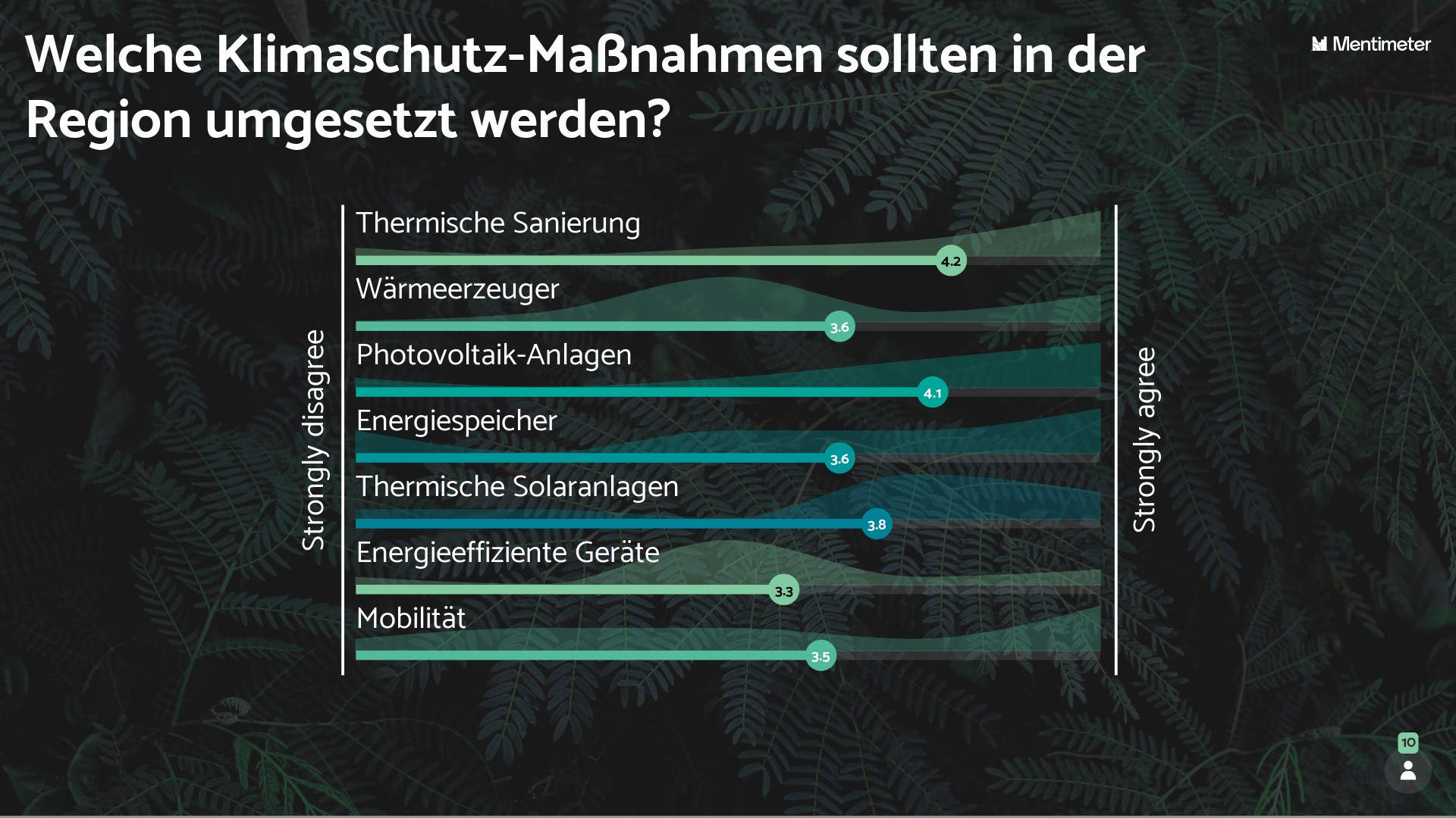 Im anschließenden Diskussionsforum konnte weiter auf die Einzelmaßnahmen eingegangen werden. Dabei wurden Musterbeispiele aus der Region vorgestellt und Interessierte konnten ihre Erfahrungen zu Einzelmaßnahmen wie thermische Sanierung oder Dachbegrünung austauschen. Eine spannende Diskussion entstand darüber, welche Maßnahmen prioritär umgesetzt werden sollten. Die Vielzahl der Maßnahmen zum Klimaschutz und zur Klimawandelanpassung erschwert manchmal die Entscheidung zur Umsetzung einer spezifischen Maßnahme. Daher wurde über online Mentimeter-Abstimmung die Einschätzung der Teilnehmenden abgefragt, welchen Maßnahmen in der Region umgesetzt werden sollten.