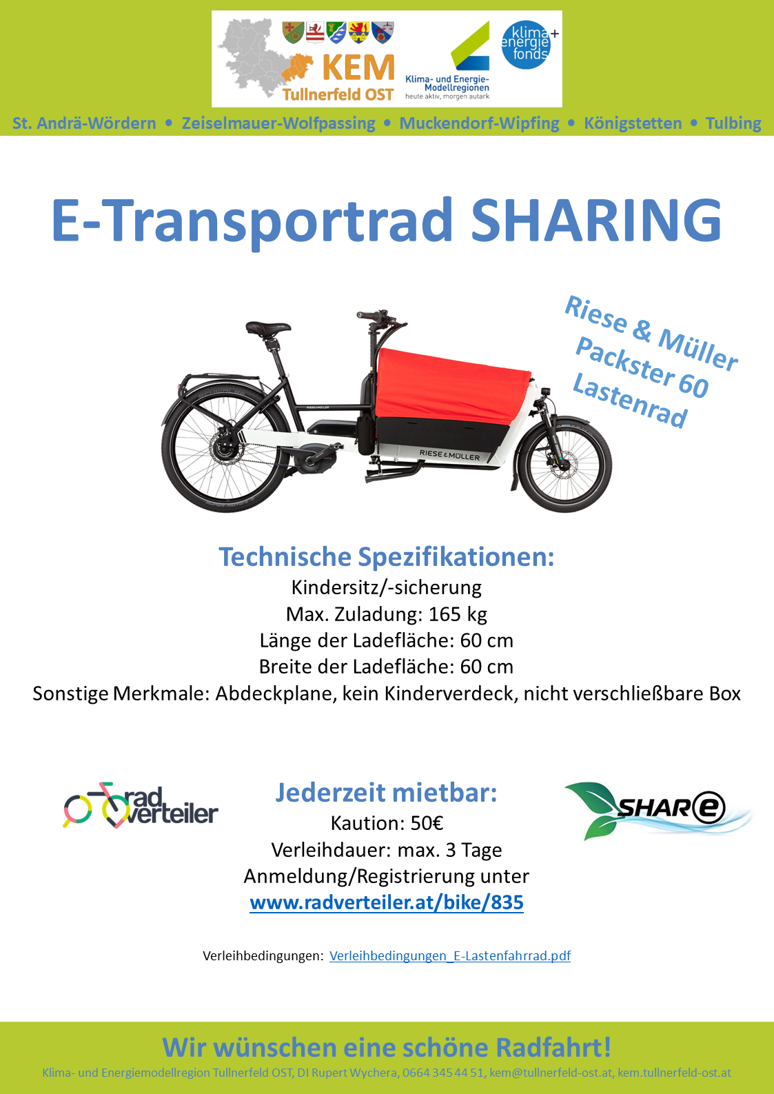Wer einmal interesse hat, die Alltagstauglichkeit eines E-Lastenfahrrades zu testen, der kann sich gerne für eine bis zu 3-tägige Testphase ein tolles Rad ausborgen. Ob es darum geht die Einkäufe ohne Auto nach Hause zu bringen, Bierkisten zum Sportverein zu transportieren oder einfach nur mit den Kindern vorne drinnen einen lustigen Ausflug zu machen - nutzen Sie die Möglichkeit, die super Fahreigenschaften in der Praxis zu testen.