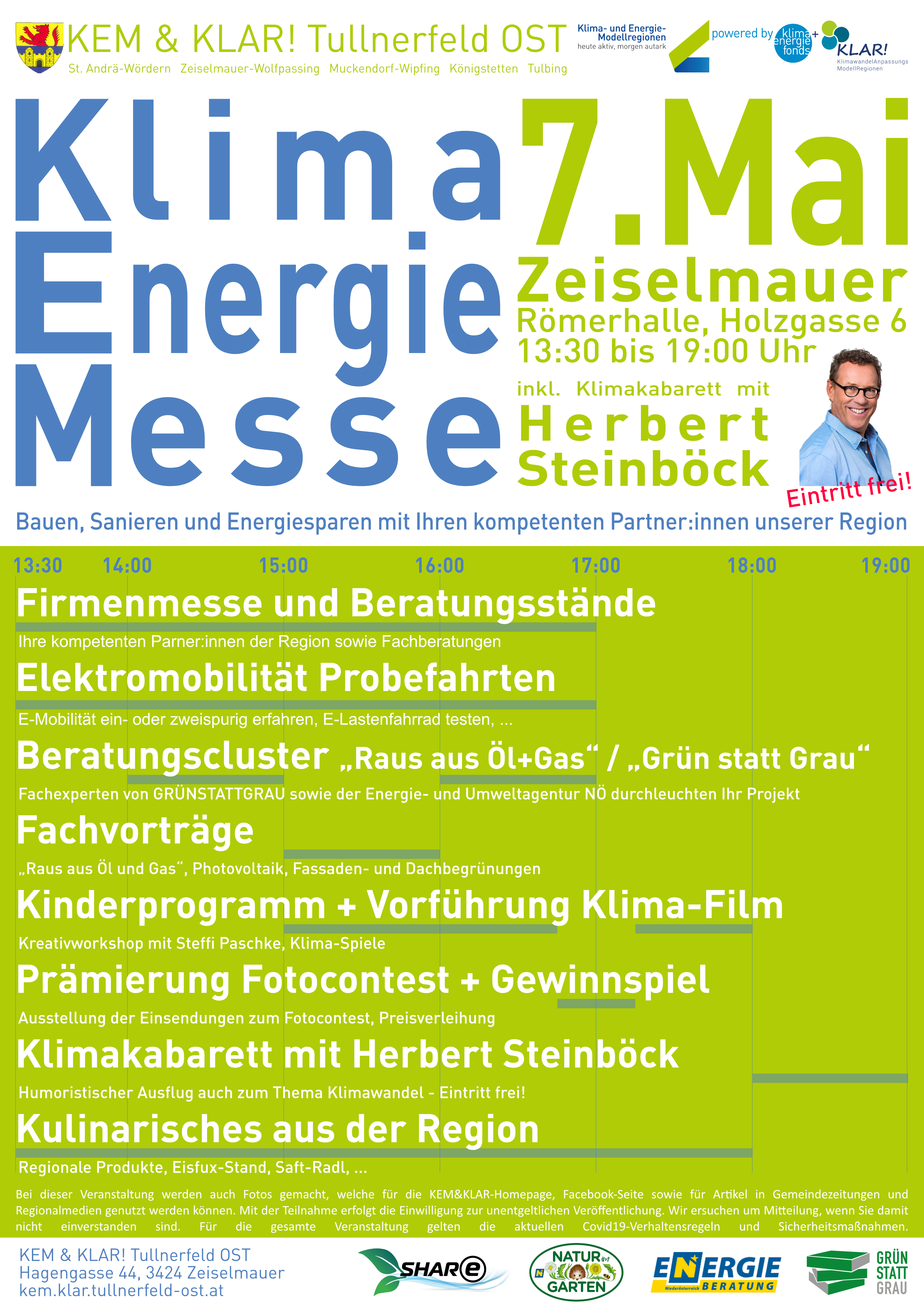 Auf dieser Messe werden zu den Themen rund ums Bauen und Sanieren kompetente Partnerinnen und Partner aus unserer Region sachkundige Information anbieten und für Fragen bereit stehen. Ergänzt wird das Angebot durch Expertinnen und Experten der Energieberatung NÖ sowie von "GrünStattGrau." Weitere Themenschwerpunkte: "Heizungstausch - Raus aus Öl & Gas", "Photovoltaik & Speicher", "Dach- und Fassadenbegrünung". Darüber hinaus können die Besucherinnen und Besucher die Vorzüge der Elektro-Mobilität „erfahren“ und weitere Mobilitätsangebote testen.