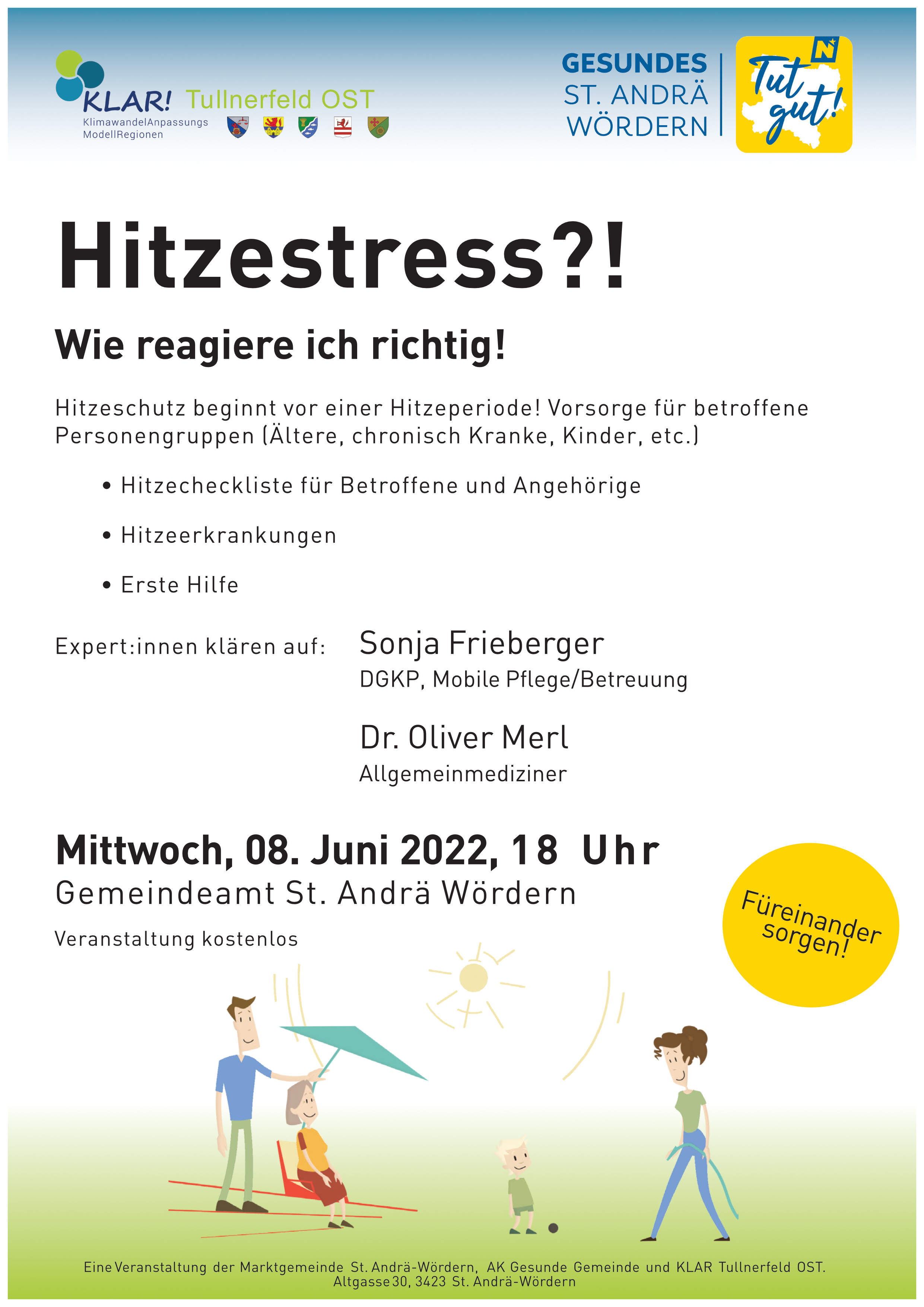 Hitze-Workshop "Hitzestress! Wie reagiere ich richtig?" Vorträge und Tipps von Expert:innen aus der Region Hitzeschutz beginnt vor einer Hitzeperiode! Expert:innen berichten über wichtige Vorsorgemaßnahmen für betroffene Personengruppen (Ältere, chronisch Kranke, Kinder, etc.) und geben Einblicke in die medizinische Praxis während Hitzephasen.