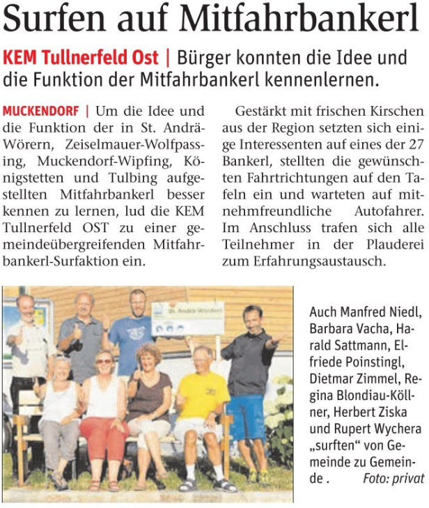 Im Herbst vergangenen Jahres wurden in der KEM-Region Tullnerfeld OST in allen 5 Gemeinden 'Mitfahrbankerl' aufgestellt. Die Idee dahinter ist die Förderung des gemeinsamen Fahrens, aber auch die Nutzung als zusätzliche Rastplätze und die Stärkung der Gemeinschaft in der Region.